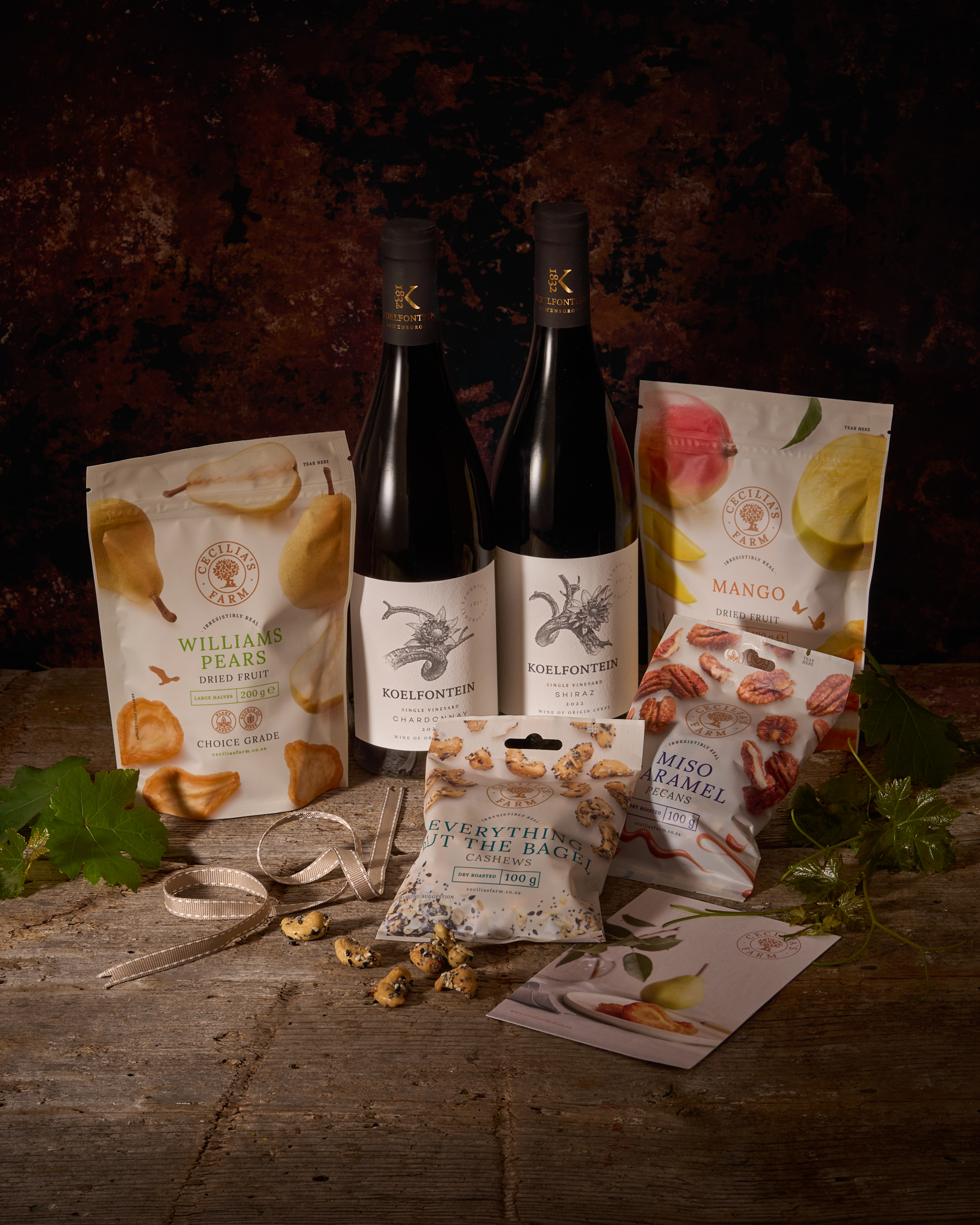 Koelfontein Shiraz 2022 750ml Koelfontein Chardonnay 2023 750ml Cashews – Everything Bagel 100g Williams Bon Chretien Pears 200g Pecans – Caramel Miso 100g Mango Choice 100g Cecilia's Farm Large Gift Box Tissue Paper Wrapping & Ribbon Card